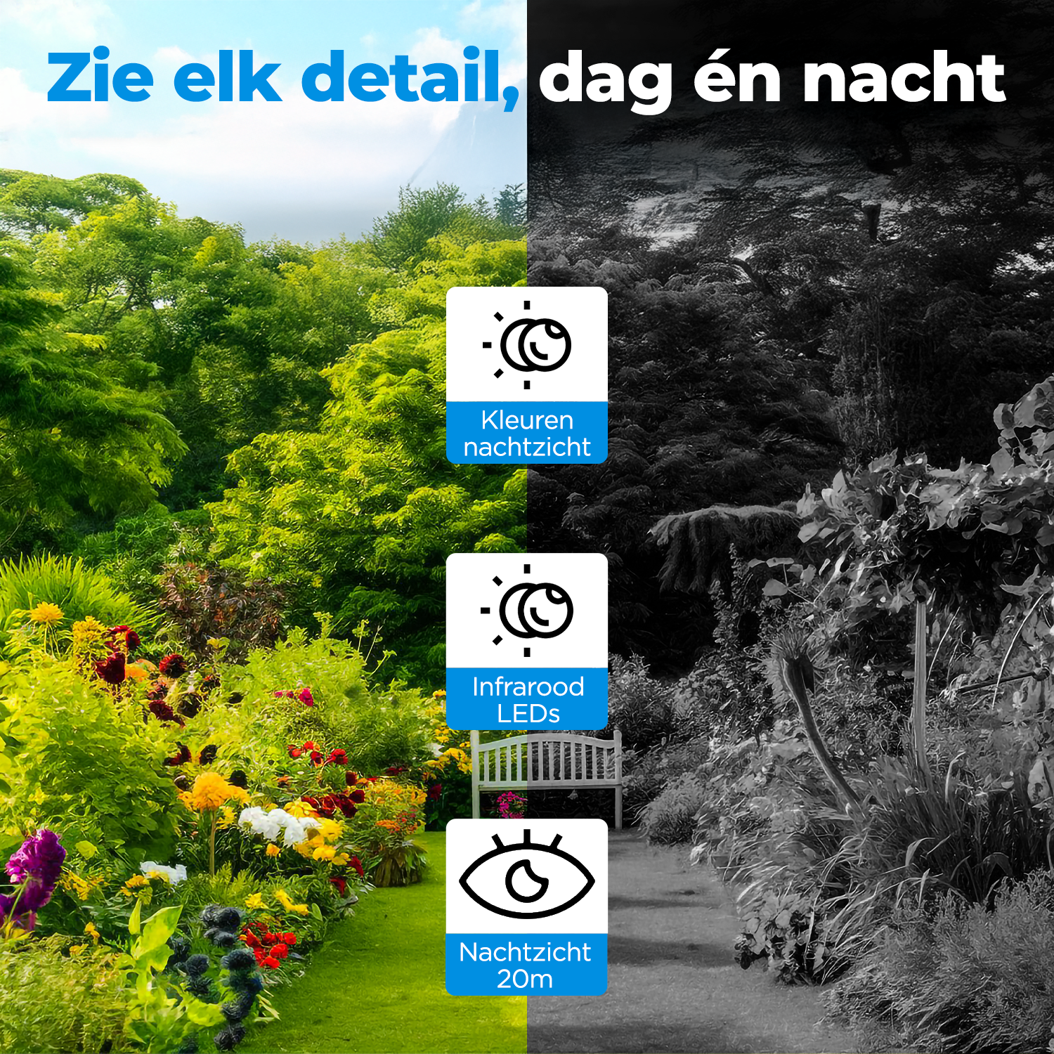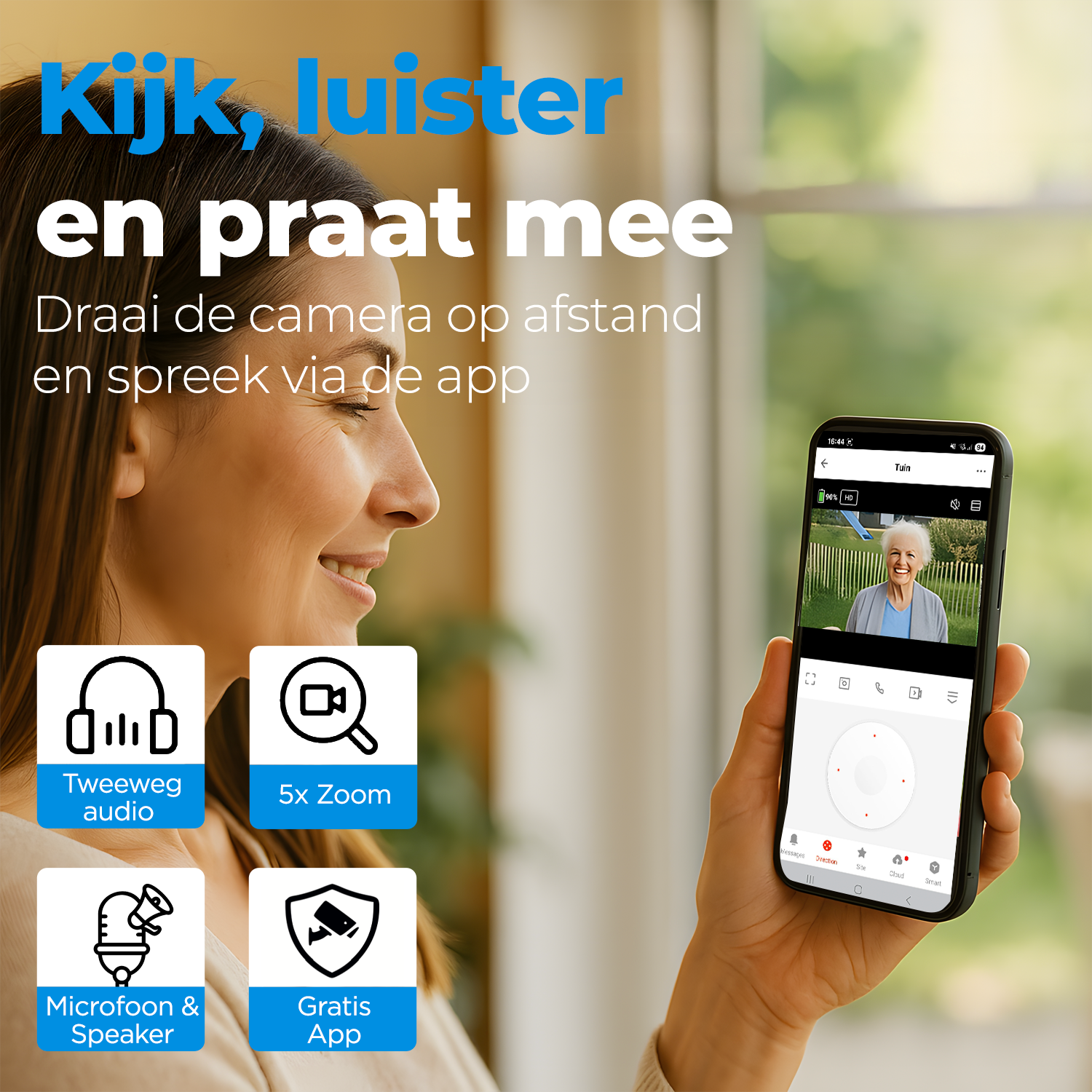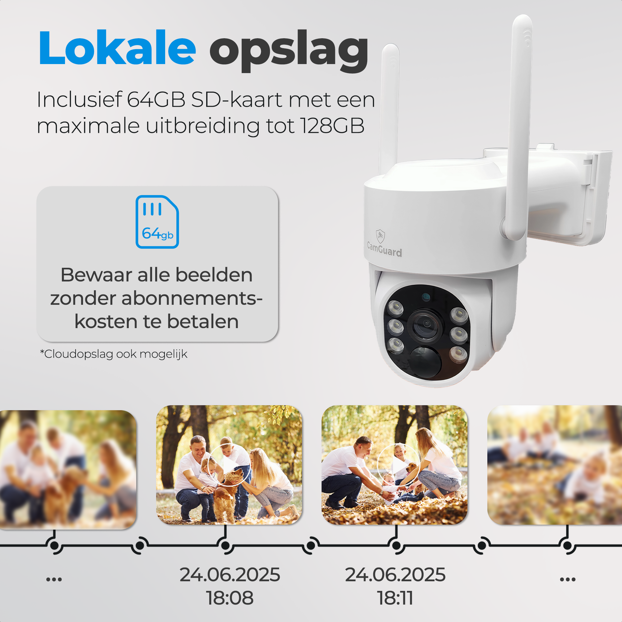 U kunt tot ongeveer twee weken terug kijken met de meegeleverde 64GB sd geheugenkaart. Als de sd-kaart vol zit worden oude beelden automatisch verwijderd. Zo mist u nooit een gebeurtenis.