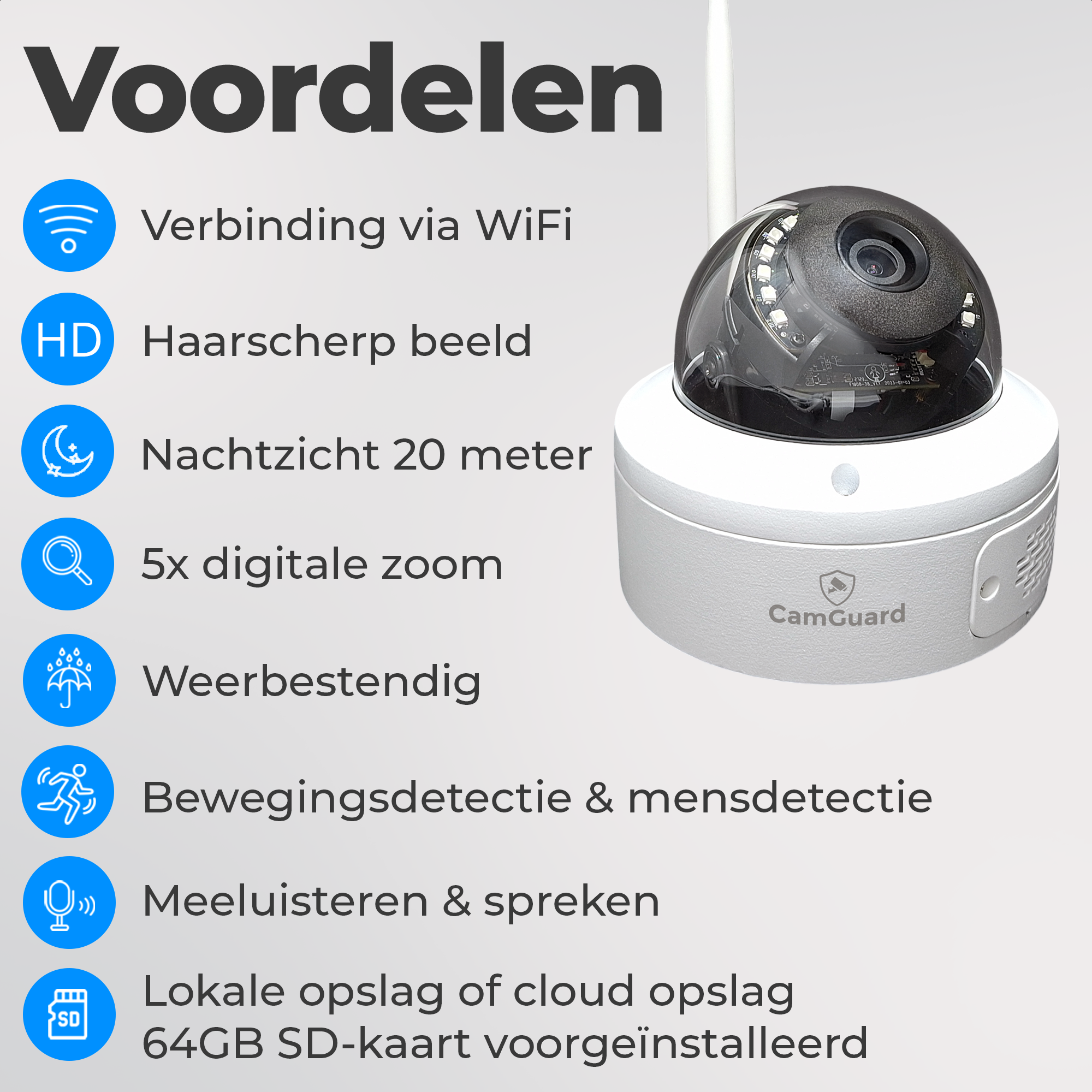 - 1x Dome camera (met voorgeïnstalleerde 64GB SD-kaart)